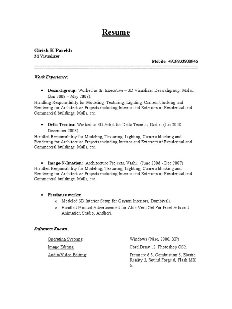 This 3d visualizer resume format covers job description and objective tips which will guarantee you for your dream job as fresher... · expert in all version of autocad and... · expert and highly skilled in 3d software, such as 3d studio max and autodesk viz for 3d rendering and animation.